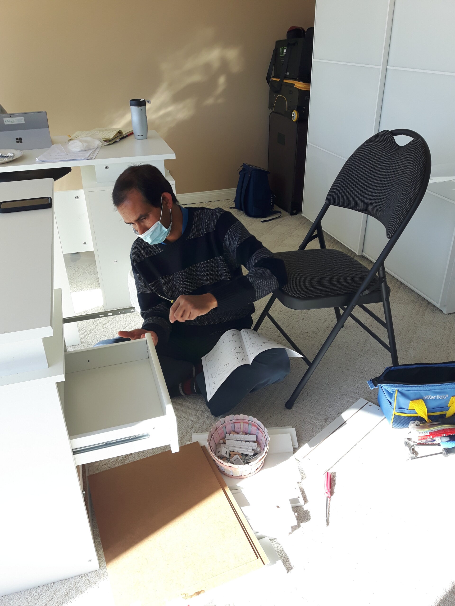 Syed Afzal assembling drawers for office desk