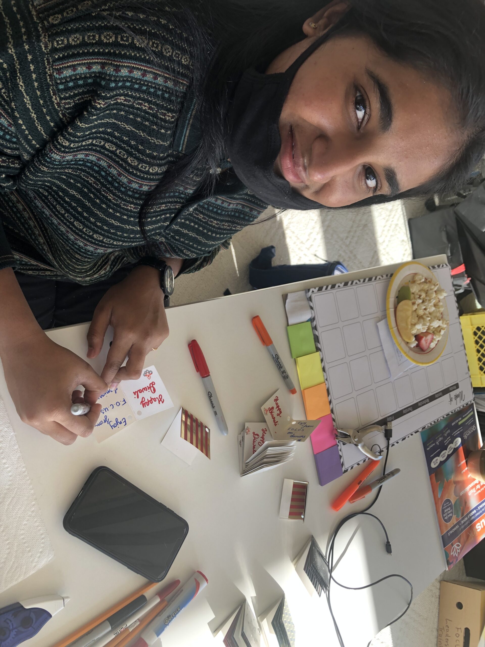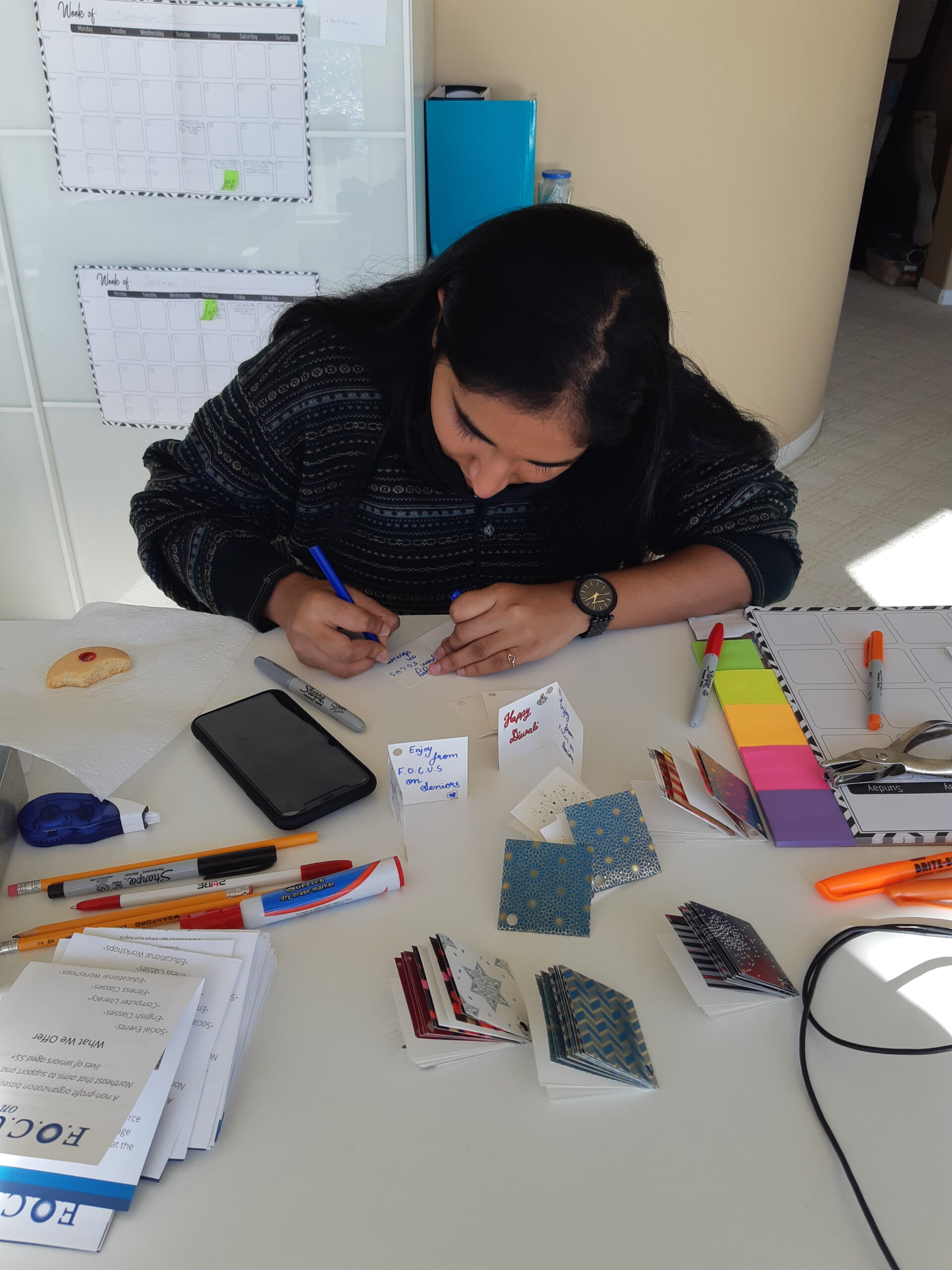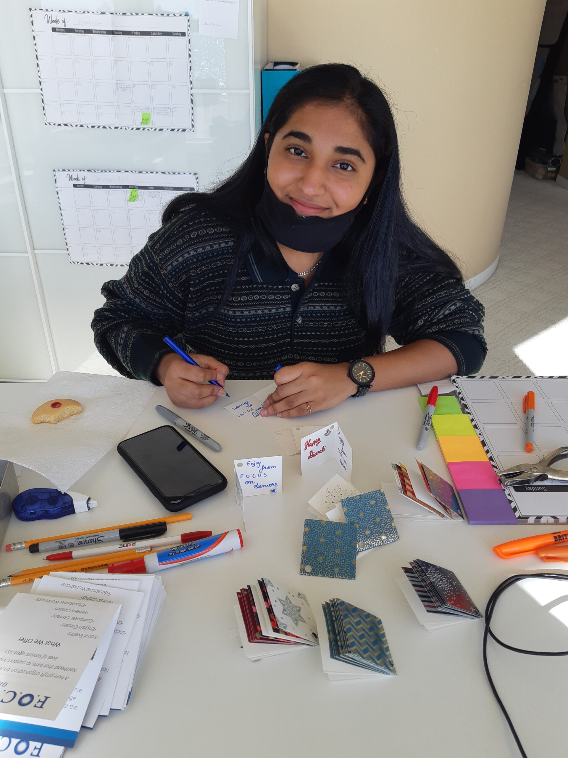 Rozy engaging Dhruvee to write our Diwali greeting cards